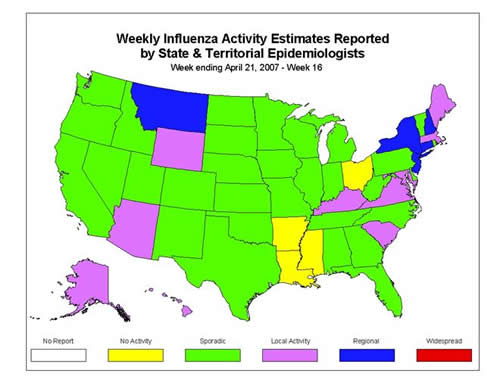 During week 16 (April 15 ? 21, 2007)*, influenza activity continued to decrease in the United States. Data from the U.S. World Health Organization (WHO) and National Respiratory and Enteric Virus Surveillance System (NREVSS) collaborating laboratories indicated a decrease in the percentage of specimens testing positive for influenza. Other surveillance systems also indicated a decrease in influenza activity. The percentage of visits for ILI to sentinel providers decreased during week 16 and was below the national baseline for the fourth consecutive week. Five states reported regional influenza activity; 10 states reported local influenza activity; the District of Columbia, New York City, and 31 states reported sporadic influenza activity; and four states reported no influenza activity. The number of jurisdictions reporting widespread or regional influenza activity decreased from 11 for week 15 to five for week 16. The percent of deaths due to pneumonia and influenza remained below baseline level.