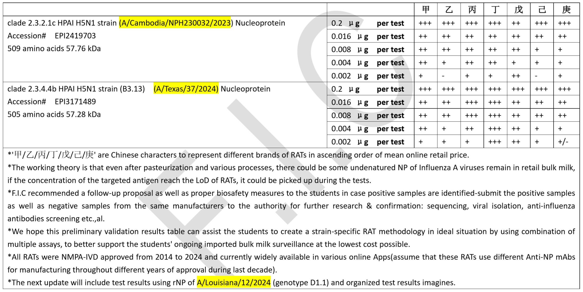 In respect of the students´ efforts, F.I.C conducted a validation experiment on market available Rapid Antigen Tests(Influenza A Virus, Nucleoprotein) in China, the results show below had been forwarded to the students to better support their methodology. F.I.C believe, a combination of existing RATs can provide useful information with detection results, and have widely potential usage in various scenarios. And most importantly, combination of existing RATs can provide enough manufacturing capacity during current situation with affordable cost due to existing competitions, people don´t have to wait for the development/approval of H5N1 specific RATs for their research purposes.